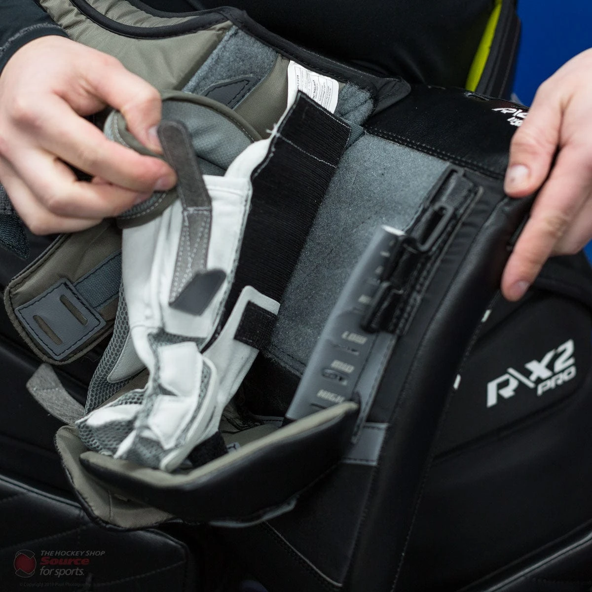 The side board of the blocker also features ample finger protection, designed to fit the goal stick without any weak spots but also no interference. The GT2 blocker has contoured finger protection to make sure your fingers are protected, no matter the shot. Using plastic molds and HD foam, you can be confident on any shot knowing you’re protected. The finger protection also has velcro adjustments to add customizability to how tightly your fingers are connect to the finger protection, giving the choice of mobility.